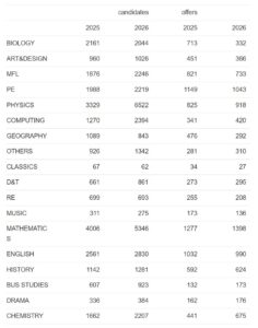Of course, the most interesting percentage of ‘offers’ is that for physics, where only 14% of candidates have so far been made an offer. It looks as if the better candidates for biology are those that have opted to apply for chemistry in 2026, resulting in a significant fall in ‘offers’ in biology.