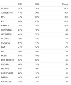 Only in Chemistry, where because of the reduction in the size of the bursary to those applying for biology courses it seems likely that those with a choice between the two subjects have opted to apply for chemistry with its higher bursary for 2026. As a result, biology, with a 17% fall in offers this March when compared with March 2025, is the big loser.