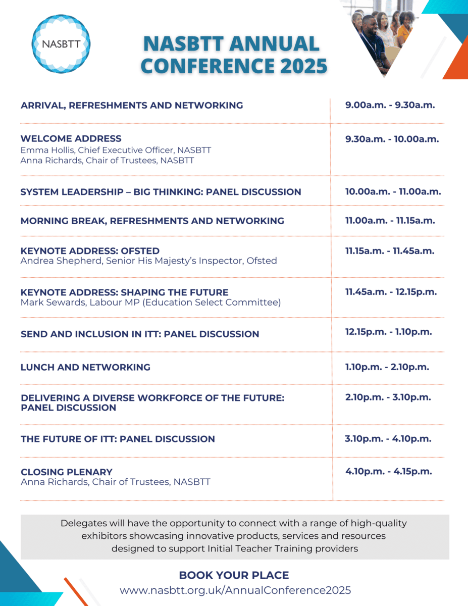 At NASBTT's Annual Conference 2025, delegates will have the opportunity to connect with a range of high-quality exhibitors showcasing innovative products, services and resources designed to support Initial Teacher Training providers. The exhibition area will offer a valuable chance to meet leading organisations, discover new solutions and gather insights to enhance programmes. Alongside this, the Annual Conference provides a unique platform for networking with peers and colleagues from across the ITT sector, sharing ideas, challenges and best practice to strengthen connections and build lasting professional relationships.