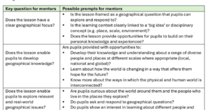 Prompts are also provided to support mentors when they observe lessons to ensure that feedback has a geographical focus. As shown in the extract below, the prompts encourage mentors to consider ideas such as whether the lesson observed is rooted in enquiry, addresses key geographical concepts and provides opportunities for pupils to make connections to their everyday lives as well as within and between geography topics.